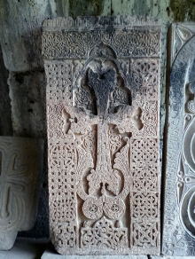 歩いていると大きな十字架が彫られた石が立っているところに出ました。 アルメニア教会の特徴であるハチュカル(十字架石)です。 墓石として使用されたもので、必ず西を向いているのが特徴だそうです。
