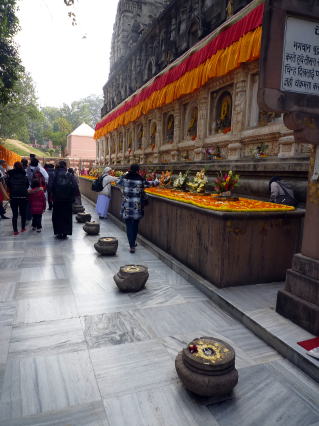 寺院内に祀られている仏像は11世紀のパーラ朝のもの。毎日衣を変えています(左下)。 本堂周囲は仏塔や数々の仏で飾られていました。