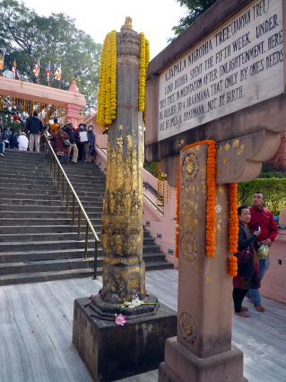 中国から亡命したカルマパ17世は次世代のチベット亡命者の中核になるとされている高僧です。 チベット語の説法は理解不能ですが、同じ場に居合わせることが出来たのはありがたいことです。 今度は寺院の左側に移動。 アショカ王柱(左下)の奥に池があり、ちょっと変わった像が置いてあります(右下)。