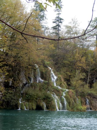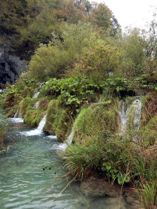 まずは、ヴェリキ滝を目指して高台から下りて行きます。 木立の間から見える滝も美しい。 ![]() 少し降りると湖の向こう側に渡すための遊歩道があるのですが、 よく見るとここにも小さな滝 ![]() これも石灰岩の沈殿物が造った自然の堰のようです。 遊歩道を渡って湖の向こう側に渡り、ヴェリキ滝に近づくと 遊歩道の下を水が音を立てて流れ落ちて行きます。