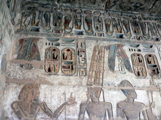 | ラメセス3世葬祭殿(メディネト・ハブ葬祭殿) ルクソール西岸にあるラメセス3世葬祭殿 非常に保存状態の良い神殿です。 彫りの深さと色の鮮やかさが見事。 2004年12月訪問 写真は神殿天井に残る美しい壁画 ![]()