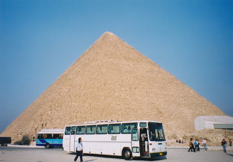 ギザのピラミッド カイロから15キロほどの台地にギザの三大ピラミッドはあります。 行ってみると、街のすぐ近くにあるのに驚きます。 写真は展望台から見たギザの三大ピラミッド ピラミッドが台地の縁に建っていること、すぐ後ろには街が迫っていることが分かるでしょうか。 左からクフ、カフラー、メンカウラーのピラミッド ![]() この角度から見るとカフラーのピラミッドが一番大きく見えますが、 実際は左のクフ王のピラミッドが最も大きなピラミッドです。 クフ王のピラミッドは元々の底辺が約230m、高さは約147m。 カフラー王のピラミッドは底辺が約215m、高さは約144m。 そして、メンカウラーのピラミッドは底辺が約105m、高さが約66m。 左がクフ、右がカフラー ![]() クフ王のピラミッド ![]()