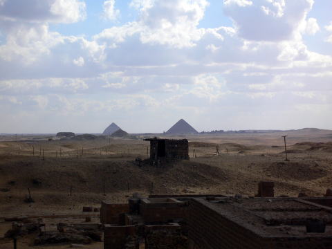 サッカラからは他のピラミッドも見ることができます。 階段ピラミッド北側から見たギザのピラミッド群(左側)とアブシールのピラミッド群(右側)。 ![]() こちらは階段ピラミッドの南側から見た風景。 ダフシュールの屈折ピラミッド(左側・手前に小さなピラミッド?が見える)と赤ピラミッド。 ![]() ピラミッドは、やはりロマンです。 謎が解けてほしいような、謎のままであって欲しいような・・ アフリカの遺跡に戻る 参考文献 図説古代エジプト1(河出書房新書ふくろうの本) 世界遺産を旅する12(近畿日本ツーリスト) 古代エジプトうんちく図鑑(芝崎みゆき バジリコ株式会社) 基本的には現地ガイドさんの説明を元にまとめています。 |