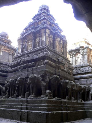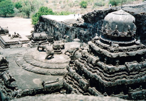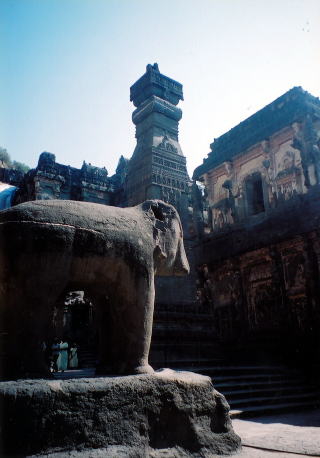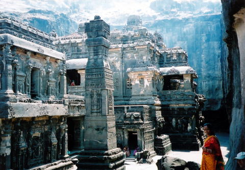 | エローラ(カイラーサ・ナータ寺院) インド西部にある石窟寺院エローラ 7〜10世紀に建てられた仏教・ヒンズー教・ジャイナ教の石窟寺院が34も残っています。 最大の見どころは、やはりなんといってもカイラーサ・ナータ寺院。 2001年5月、2006年1月 写真は岩山から彫り出された第16窟カイラーサ・ナータ寺院 ![]() エローラは見どころが多いので、カイラーサ・ナータ寺院とジャイナ教・仏教寺院で分けました。 ジャイナ教・仏教寺院はこちら→エローラ(ジャイナ教・仏教寺院) 第16窟カイラーサ・ナータ寺院