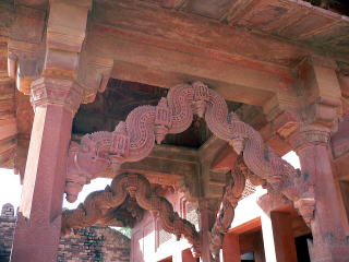 ディワーニ・ハースのすぐ隣の建物 ![]() ファテープル・シークリーの見どころの一つは美しい石彫りです。 赤砂岩で出来ている建物は、どれも美しい彫りで飾られています。透かし彫りの技術も凄い。