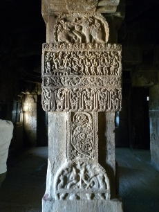 ![]() 入口を守る神ドゥヴァーラーバラ(左下)と柱に彫られた美しい男女像(右下)