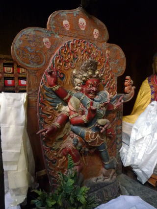 現地ガイドさんの後を付いて進み、お堂に着きました。 本尊はお釈迦様のようです。 ![]() チベット独特の仏も置かれていました、 十一面千手観音かと思いましたが、傘を持っています。 この傘で一切衆生を救ってくれるのだそうです。 白傘蓋仏母といいます。