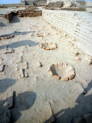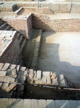 昔はモヘンジョダロの家には水洗トイレがあり、排水溝は汚水を流すものと言われていましたが 最近では水洗トイレとされたのは水を使う儀式の場と考える説が有力のようです。 このため、排水溝が何を流すためだったのかも議論となっています。 沐浴場 沐浴場に着きました。 写真中央の青い看板がストゥーパの上から小さく見えた看板です。 ![]() 手前に写っている煉瓦の台の上に柱があり、木製の屋根がありました。 沐浴場の広さは12m×7m。深さは2.5m。 小学校によくあるプールの半分位の大きさですが、かなり深さがあります。 南側と北側の2か所に階段が造られています。 ![]()