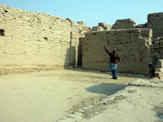踊り子像から更に進むと巨大な神官王像が置かれ、その背後に遺跡が見えて来ます。 最初の写真にも写っているモヘンジョダロ遺跡の象徴とも言えるストゥーパです。 ![]() モヘンジョダロは4キロ四方と非常に広大な遺跡です。 インダス文明最大の都市で3万人が暮らしていたと言います。 しかし、発掘されているのは、そのわずか15% 遺跡はストゥーパ周辺の「城砦部」と呼ばれる高台にある区域と 住居の並ぶ「市街地」に分かれています。 城砦部 まずは高台にある城砦部。ストゥーパを目指します。 城砦部は遺跡西側に位置します。 ストゥーパ ![]()