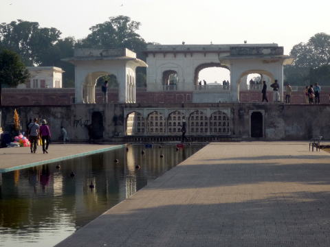 池の反対側から見た小宮殿 かっては黄金や宝石で飾られた美しい宮殿だったそうです。 ![]() 2段目の端から一番下のテラスを撮ってみました。 白大理石で通路のような橋のようなものが建てられています。 ![]() 一番下の壇に降りて見てみました。 ![]() ここも面白い構造