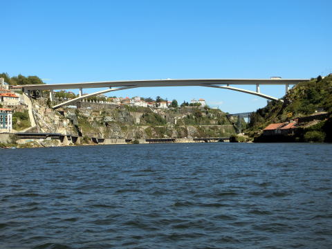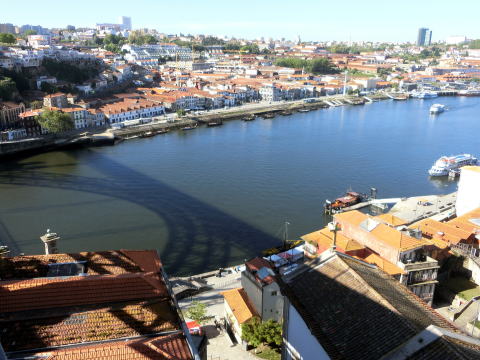 ドン・ルイス1世橋とドウロ川周辺 サン・ベント駅近くのホテルを出てカテドラルを横目に進むとドン・ルイス1世橋。 橋の上を地下鉄が走ってます。 ![]() どこが橋か、ちょっと分かり難いですね。 写真中央のドームのある建物(セーラ・ド・ピラール修道院)は川の南岸に建っています。 北岸の旧市街を守る城壁から修道院の手前くらいまでが橋となります。 橋から覗き込むと、ドン・ルイス1世橋の影が綺麗にドウロ川にかかってました。 ![]()