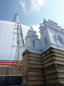 アバヤギリ大塔と沐浴場 アバヤギリ大塔はかってスリランカにあった大乗仏教の総本山。 大塔は紀元前1世紀に建てられたもので、僧達の沐浴場も残っています。 しかし、スリランカは12世紀以降上座部仏教(小乗仏教)となったため、現在はすっかりさびれています。 大塔も残念ながら修復中でした。