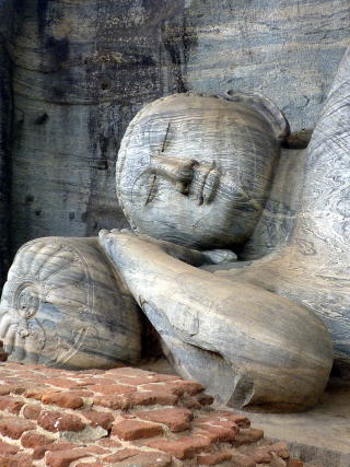 立像の高さは7m。このように腕を組んでいる仏像の姿は珍しいそうです。 立像の仏像の衣は二重線の繰り返し。これはポロンナルワ期の仏像の特徴なんだとか。 涅槃仏の全長は15m。 涅槃仏の枕の模様は太陽を表しているそうです。