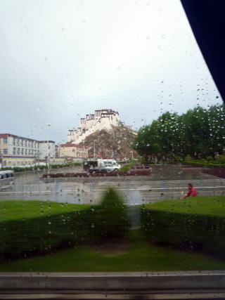 降りながら、ふと見ると・・・ 宮殿と山の接点と言うか・・・・ 山の斜面を利用して見事に建造物を建てているんですね。 山と一体化したような建物。チベット建築の凄さが分かります。 山から建物が生えてるみたい。 ![]() 下に池が見えて来ました。 かってはポタラ宮の正面にも池があったそうです。 今では埋められてポタラ宮広場となっているとか。 ![]() すっかり降りて来ました。 マニ車がずらりと置いてあります。 これを回せば経文を1回読んだことになるそうです。 左のおばさん、手にもマニ車を持ってます。 ![]() ポタラ宮の近くにある仏塔 ![]() ラサ市内から見たポタラ宮 ポタラ宮の姿は市内の至る所から見ることができます。 下の写真はラサに到着した初日に車窓から見たポタラ宮。雨が降っていました。