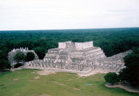 なんと2014年には、ここに立ち入ることすらできなくなっていました。 こちらは戦士の神殿横の千柱の回廊。市場だったという説もあります。 かっては木か茅葺の屋根があったと考えられています。 ![]() 人が柱の中に入っていますが、これは2002年の写真。 ここも2014年は立ち入り禁止になっていました。 チチェン・イツアーは「見るだけ」の遺跡になっていると言ってもいいかもしれません。 大球技場とジャガーの神殿 カスティージョから見た大球技場とジャガーの神殿(写真中央) カスティージョの北西にあります。戦士の神殿の反対側です。 ![]()