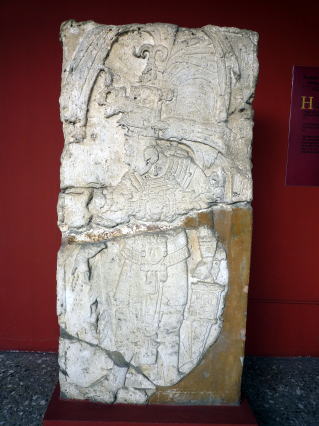 この支配者7の時代はピエドラス・ネグラスの芸術が花開いた時期と言われています。 下は玉座。古典期マヤで最も美しい玉座と言われています。 ![]() 玉座の脚、天板には碑文が刻まれ、 背もたれは巨大な仮面を表わしているのだそうです。 そして、その目の部分には2人の人物のレリーフ。 ![]() 支配者7の両親ではないかとのことですが・・・どちらが母親だろう? 戦勝記念の石碑も残っていました(石碑12)。 792年と794年の対ポニナー戦の勝利を記念したものだそうです。
