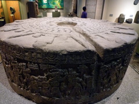 立派な円形の台座です。側面には戦う戦士のレリーフ。 ![]() 実はこれも捕虜を置いた台座。溝があるのは血を流すため。 アステカカレンダー・太陽の石 アステカ室正面に置かれたアステカカレンダー 太陽の石とも呼ばれます。